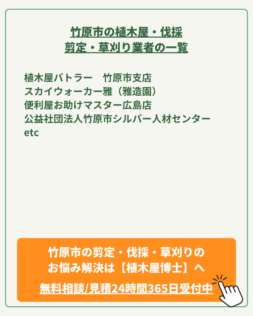 今回は、そんなお悩みを抱えるあなたに向けて、植木屋博士運営が、竹原市の植木屋さん達をご紹介します。