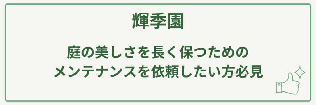 輝季園は、2025年大阪・関西万博のイギリスパビリオン植栽デザイン・施工を担当するほどの確かな技術とデザイン力を持ち、エクステリア、ドライガーデン、ロックガーデンなど、個々のライフスタイルに寄り添った心地よい庭づくりを得意としている点のような強みがあるため、「夜が一番美しい庭」といったライティング設計や、ヤシ、ソテツ、アガベなどを使った個性的なドライガーデンを追求したい方、また剪定や伐採、季節の植栽ケアなど、庭の美しさを長く保つためのメンテナンスを依頼したい愛知県常滑市・知多市・半田市を中心としたお客様におすすめです。