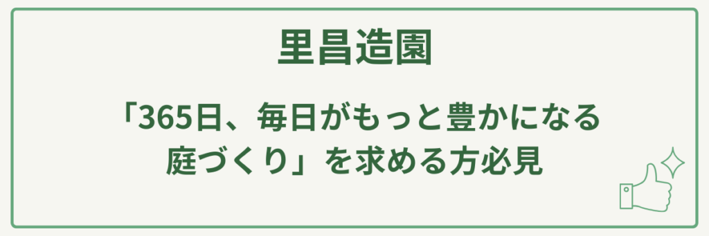 里昌造園(さとまさ造園)は、庭づくり、外構・エクステリア工事、アフターメンテナンスまで、「庭」に関わる全てを一貫して提供できる総合力が強みです。