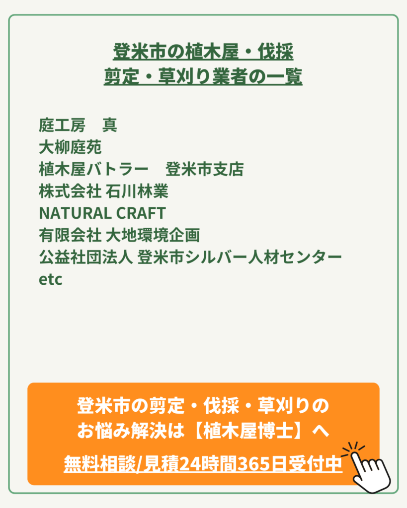 植木屋(剪定・伐採・草刈り業者)選びでお悩みの方は、是非この機会に植木屋博士の無料相談・無料見積をご活用ください。