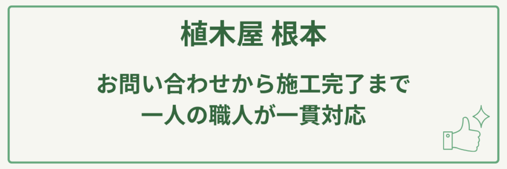 植木屋 根本は、お問い合わせから施工完了まで一人の職人が一貫対応し、中間マージンを削減しているため、リーズナブルな価格設定を実現していることが強みです。