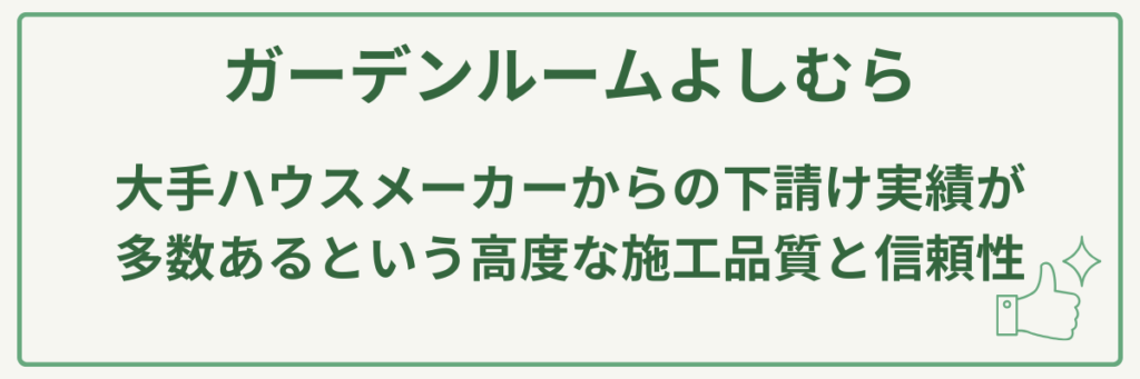 ガーデンルームよしむらは、大手ハウスメーカーからの下請け実績が多数あるという高度な施工品質と信頼性が強みです。