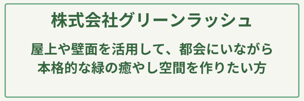 | 対応サービス | 屋上緑化、壁面緑化、自動灌水システム設計・施工、ドライミスト設置、造園メンテナンス、ベランダガーデニング |