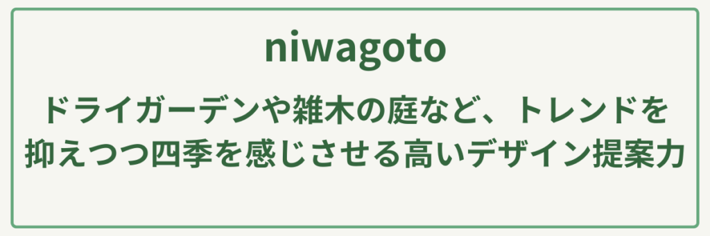 niwagotoは、神奈川県横須賀市を拠点に、スタイリッシュな庭づくりを提案する造園・外構のスペシャリストです。最大の強みは、ドライガーデンや雑木の庭など、トレンドを抑えつつ四季を感じさせる高いデザイン提案力にあります。ただ木を植えるだけでなく、耐久性にこだわった外構・エクステリアと組み合わせることで、住まいの価値をより一層高めるトータルプロデュースを得意としています。