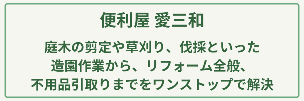 | 対応サービス | 植木剪定・伐採・草刈・不用品引取り・リフォーム全般・雨樋修理・家具移動・太陽光パネル洗浄 |