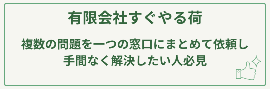 「すぐやる」という社名が示す通り、迅速な対応を心掛け、経験と思いやりをもって依頼者に寄り添います。特に、庭だけでなく家や土地の片付け、修繕、高所作業など、複数の問題を一つの窓口にまとめて依頼し、手間なく解決したい人におすすめの便利屋です。
