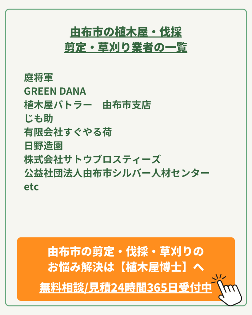 由布市で植木屋さんを探しているなら、近くのエリアの植木屋さんもチェックしておきたいですよね。