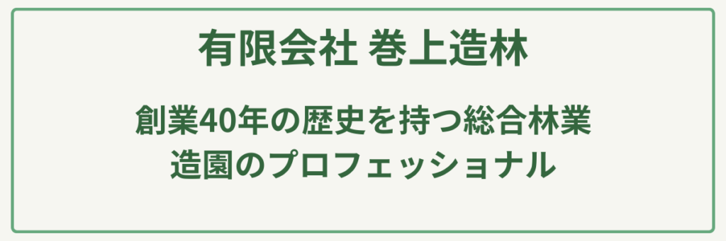 有限会社 巻上造林は、神奈川県小田原市と湯河原町を拠点とする、創業40年の歴史を持つ総合林業・造園のプロフェッショナルです。一般的な植木屋の枠を超え、林業で培った本格的な技術を強みとしており、特に**「吊し切り」などの特殊技術を用いた裏山の大木の枝落としや伐採**において、極めて高い専門性を誇ります。