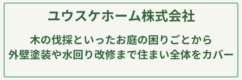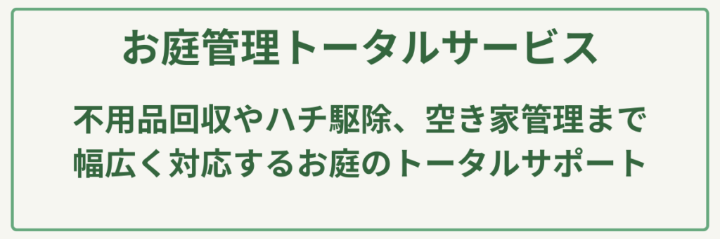 | 対応サービス | 剪定・伐採・伐根・草刈り・砂利敷き・芝生張り・害虫駆除(ハチ)・不用品回収・解体・空き家管理 |