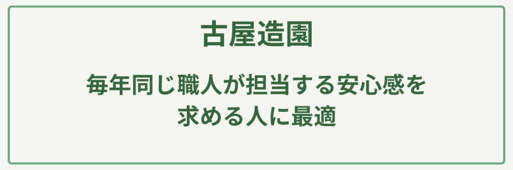 「安かろう悪かろう」を排し、丁寧かつ迅速な作業を信条としているため、「大切な庭の資産価値を維持しつつ、職人のこだわりを感じる仕上がり」を求める人に非常におすすめです。庭木1本の剪定や雑草抜きといった細かな困りごとにも快く対応してくれるため、「歴史ある信頼の業者に、親身になって庭の相談に乗ってほしい」という方にとって、これ以上ない安心感のある依頼先といえます。